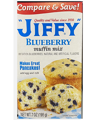 Bring bakery-style flavor to your kitchen with JIFFY Blueberry Muffin Mix. This 7 oz box makes light, moist, and sweet muffins filled with delicious blueberry flavor.